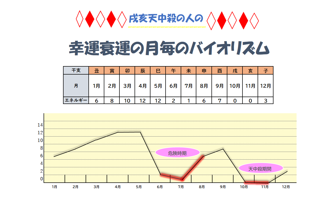 戌亥天中殺の2025年の幸運衰運の月毎のバイオリズム