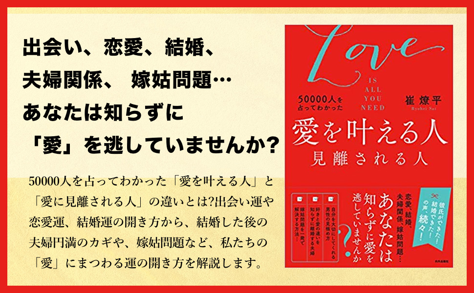 | 50000人を占ってわかった 愛を叶える人 見離される人 | https://www.amazon.co.jp/%E5%B4%94%E7%87%8E%E5%B9%B3/e/B088BZYFSN/ref=dp_byline_cont_pop_book_1 | ||