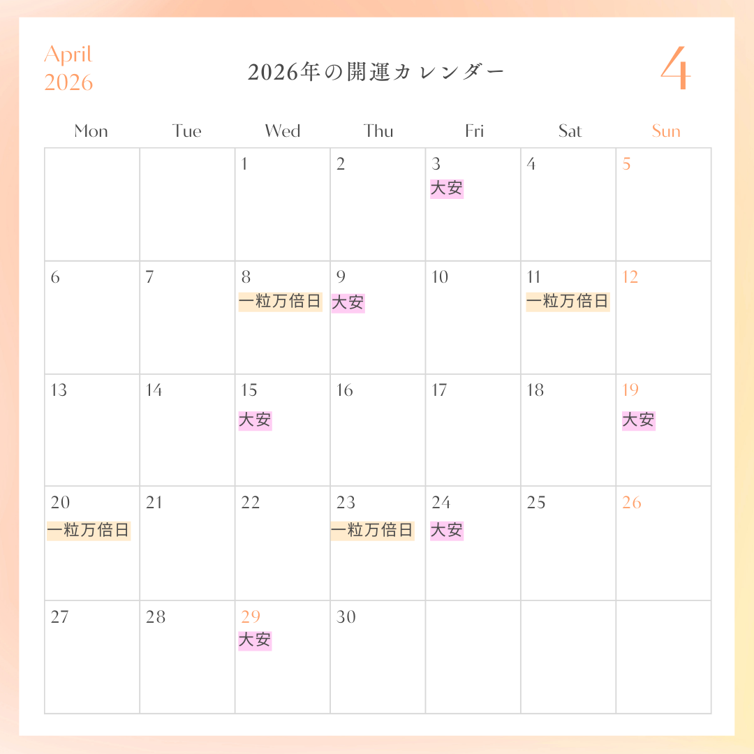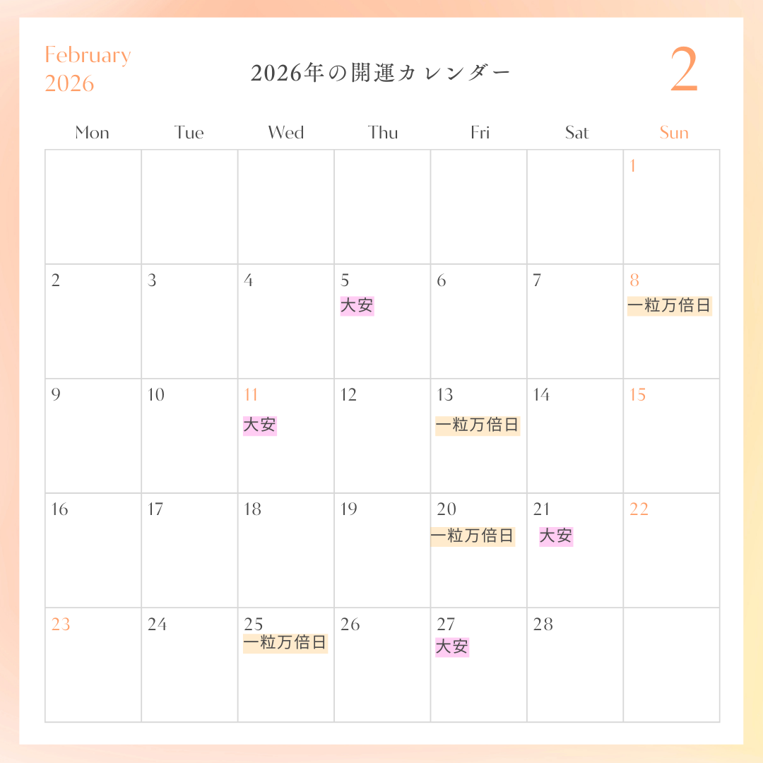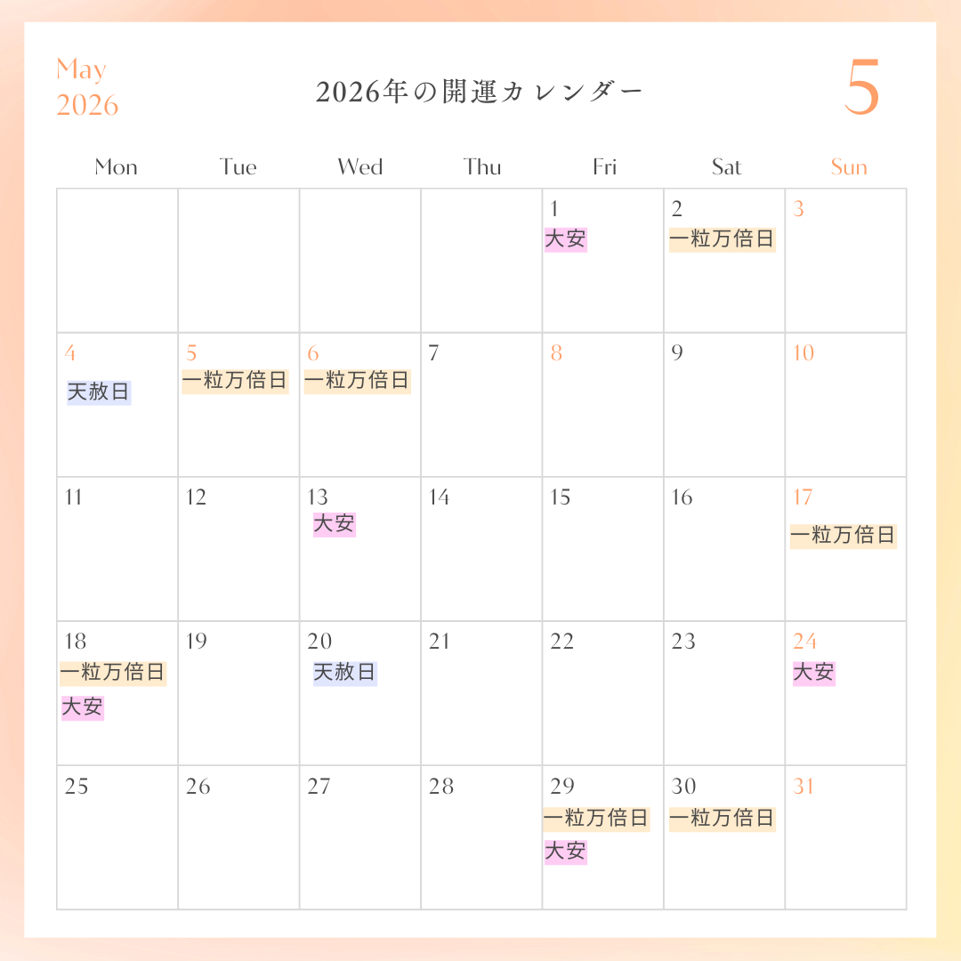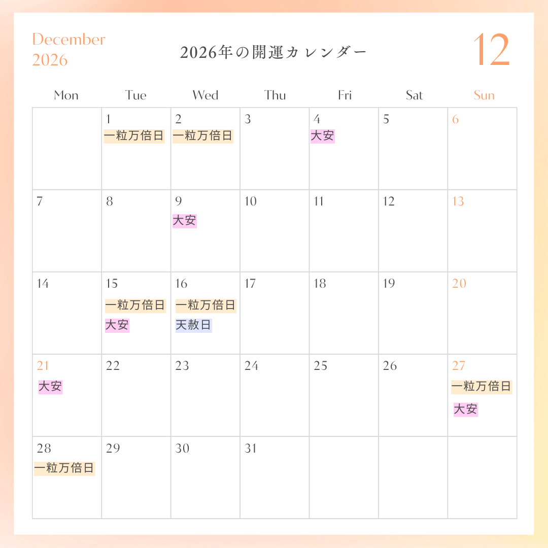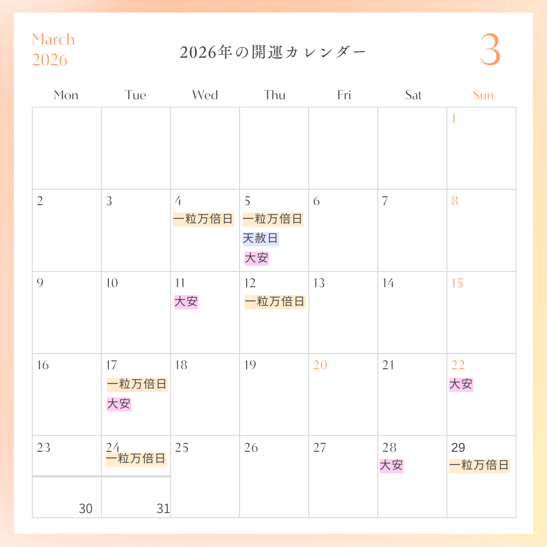 2026年の最強開運日カレンダー|一粒万倍日・天赦日・大安など
