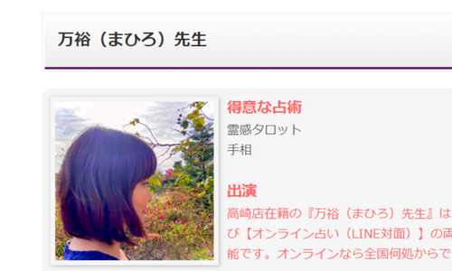 霊感タロットや手相で鑑定を行われているのが、万裕(まひろ)先生です。