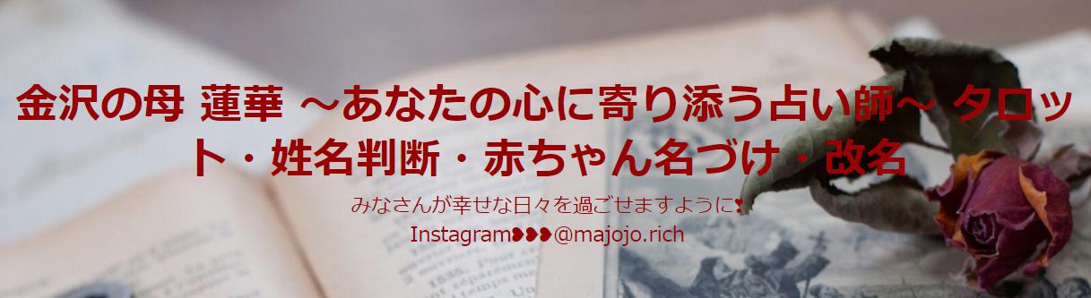 | 鑑定料金 | ・セッション姓名判断・タロット鑑定:20分/3,000円 45分/8,000円 90分/15,000円 延長:10分/2,000円 ・赤ちゃん命名:50,000円 ・赤ちゃん名付けお手伝い:25,000円 ・ビジネスネーム・プチ改名:20,000円) |