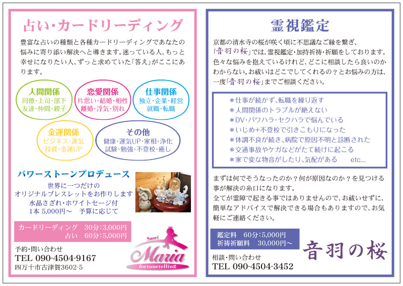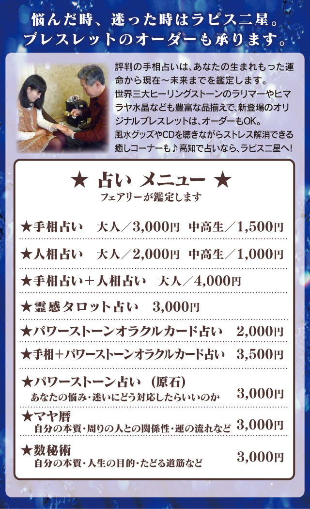 | 鑑定料金 | 50分/5,400円~ | ||
