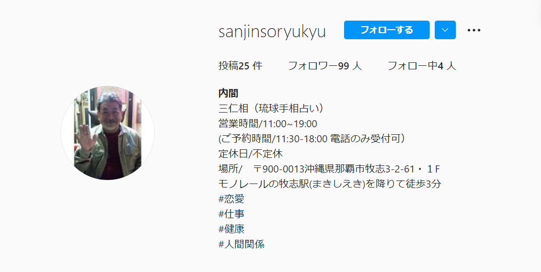 三仁相という館で琉球手相をされていますが、ユタとして霊視をしていることを忘れてはいけません。