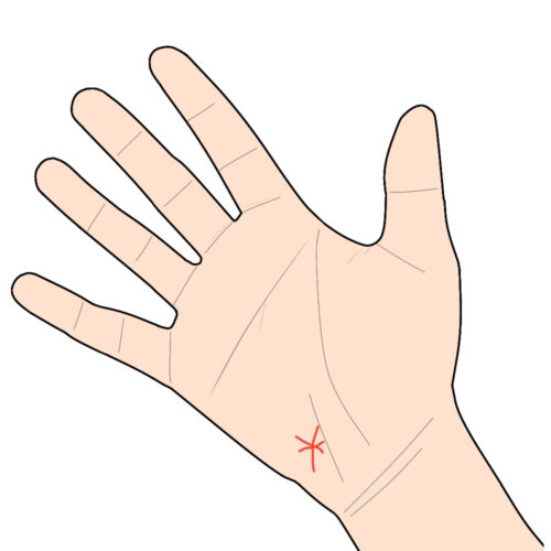 月丘に横線(斜め)で出現するもので短いのですが、手首の上に現れたら特別に愛される運命を持った人という意味です。