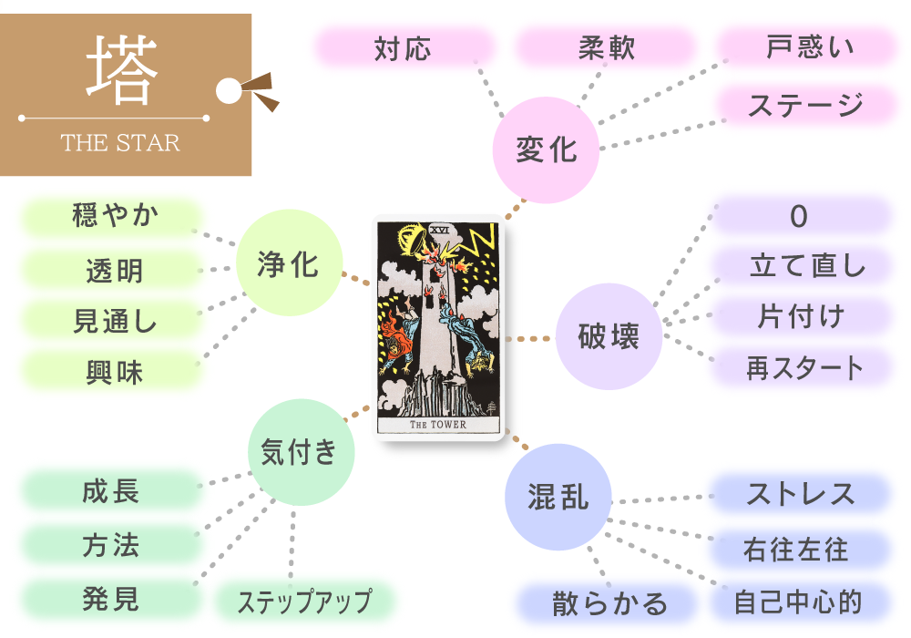 塔のカードに描かれているものは「バベルの塔」というもので、努力などによって築き上げたものが表されています。