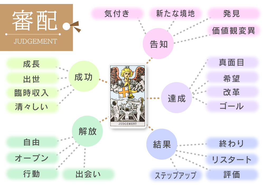 タロットカードの20番目「審判」は、正位置は「覚醒」、逆位置は「混乱」です。