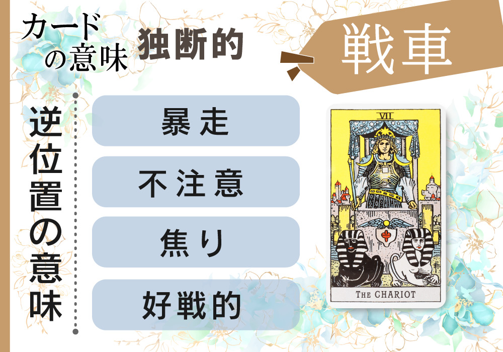 - 3 タロットカード7.戦車の逆位置の基本的な意味は「独断的」